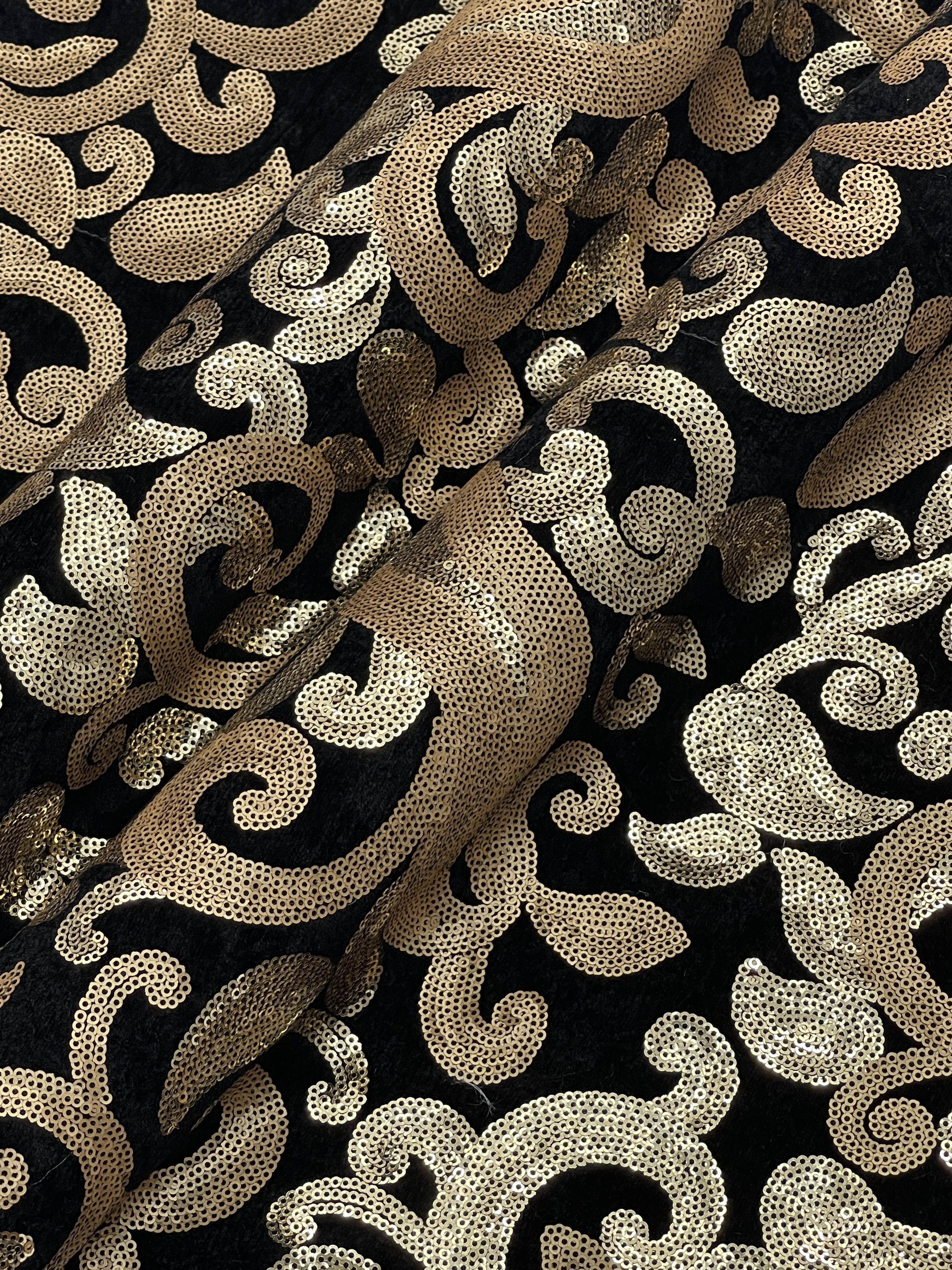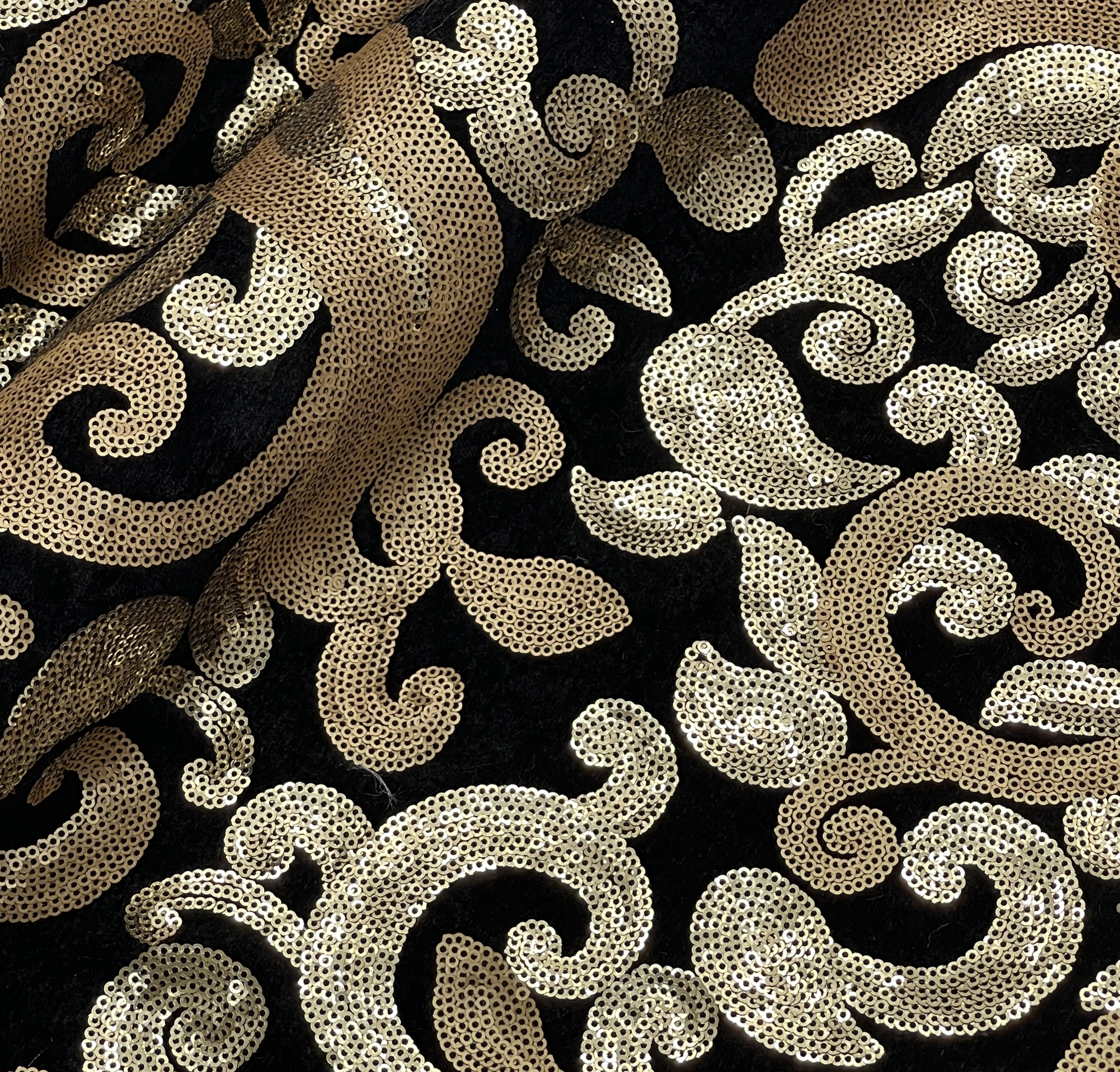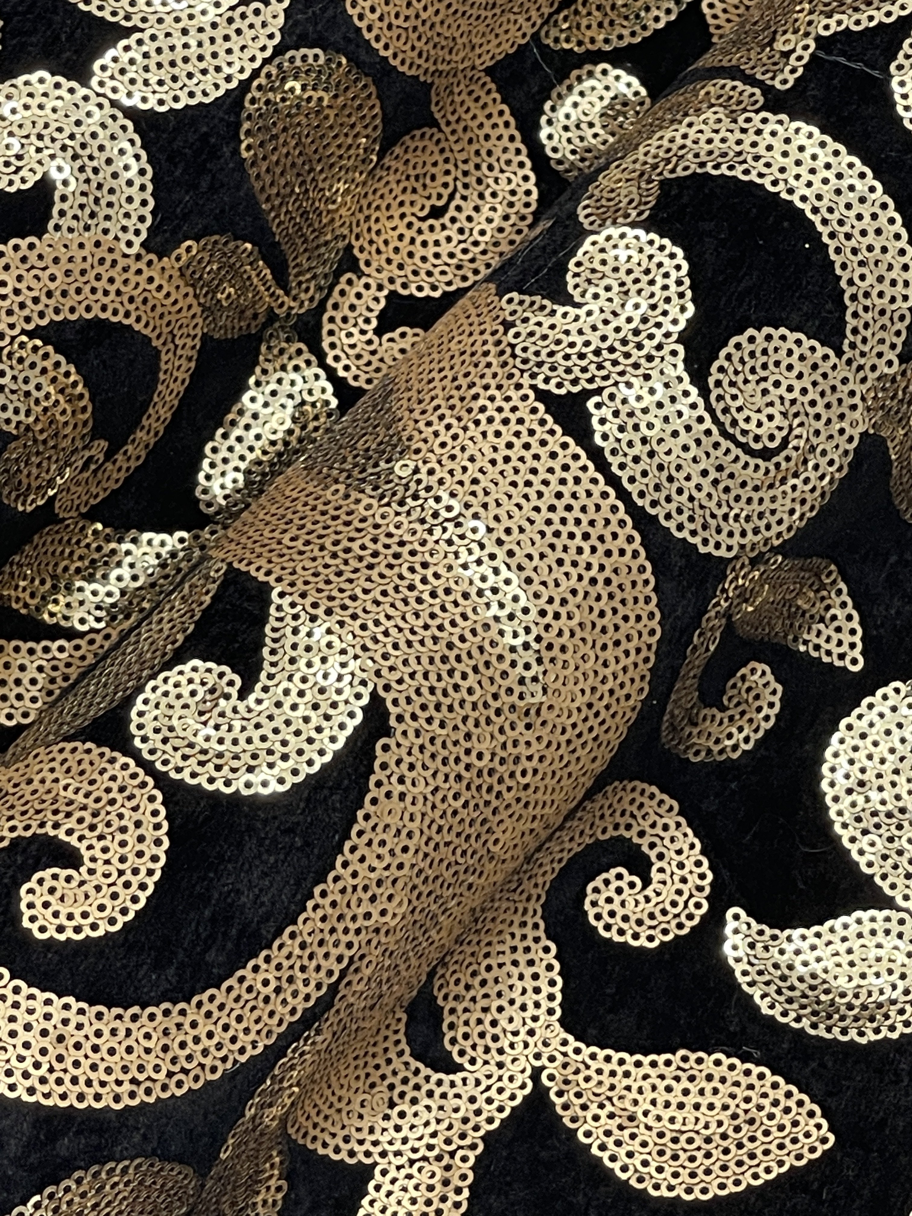 veľmi dekoratívna šatovka velúrový základ čierny a zlato-medené flitre našívané nie lepené…vhodné na spoločenské šaty, bolérka, doplnky,